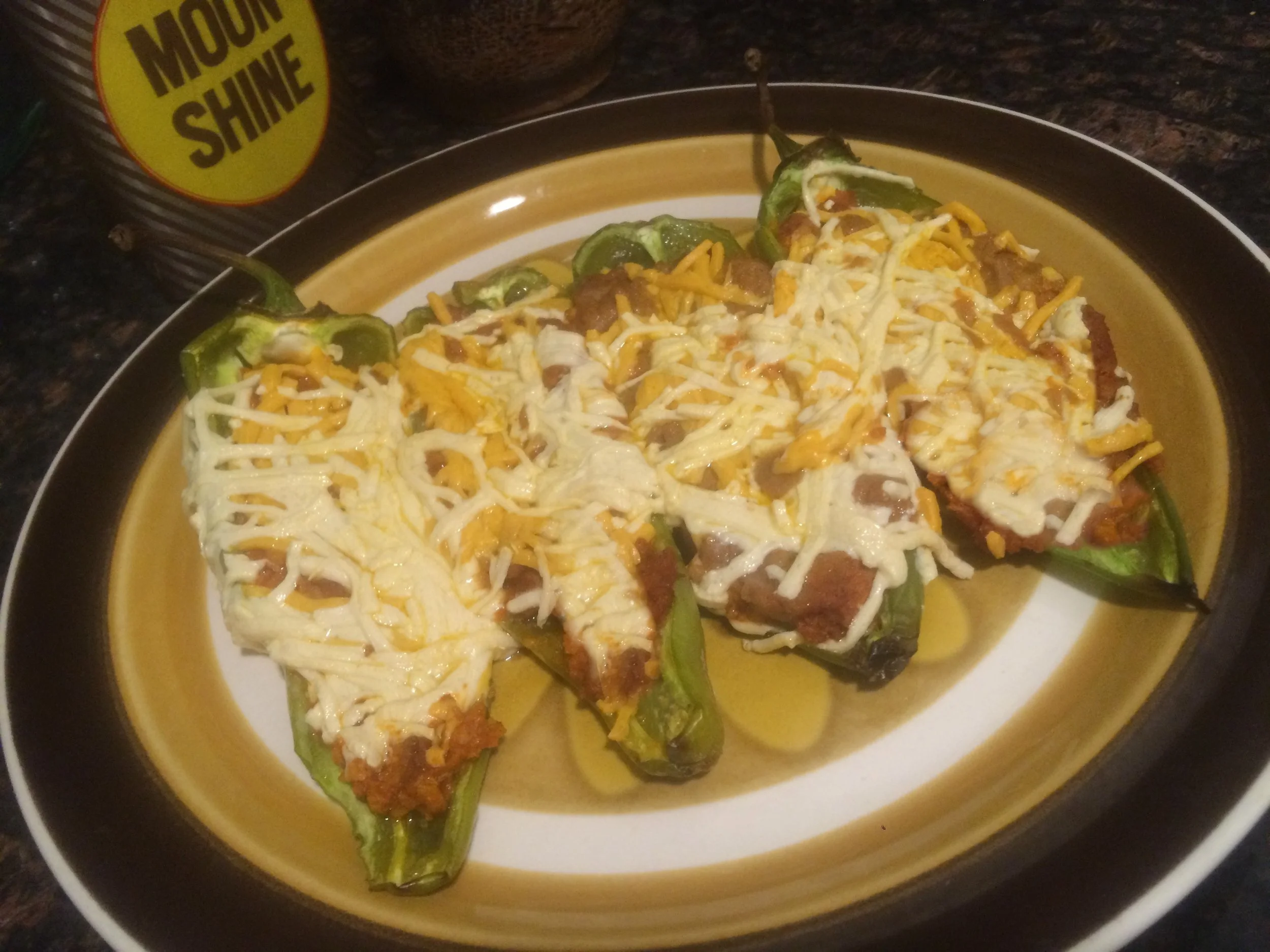 Hatch Peppers with refried beans & plant cheese.