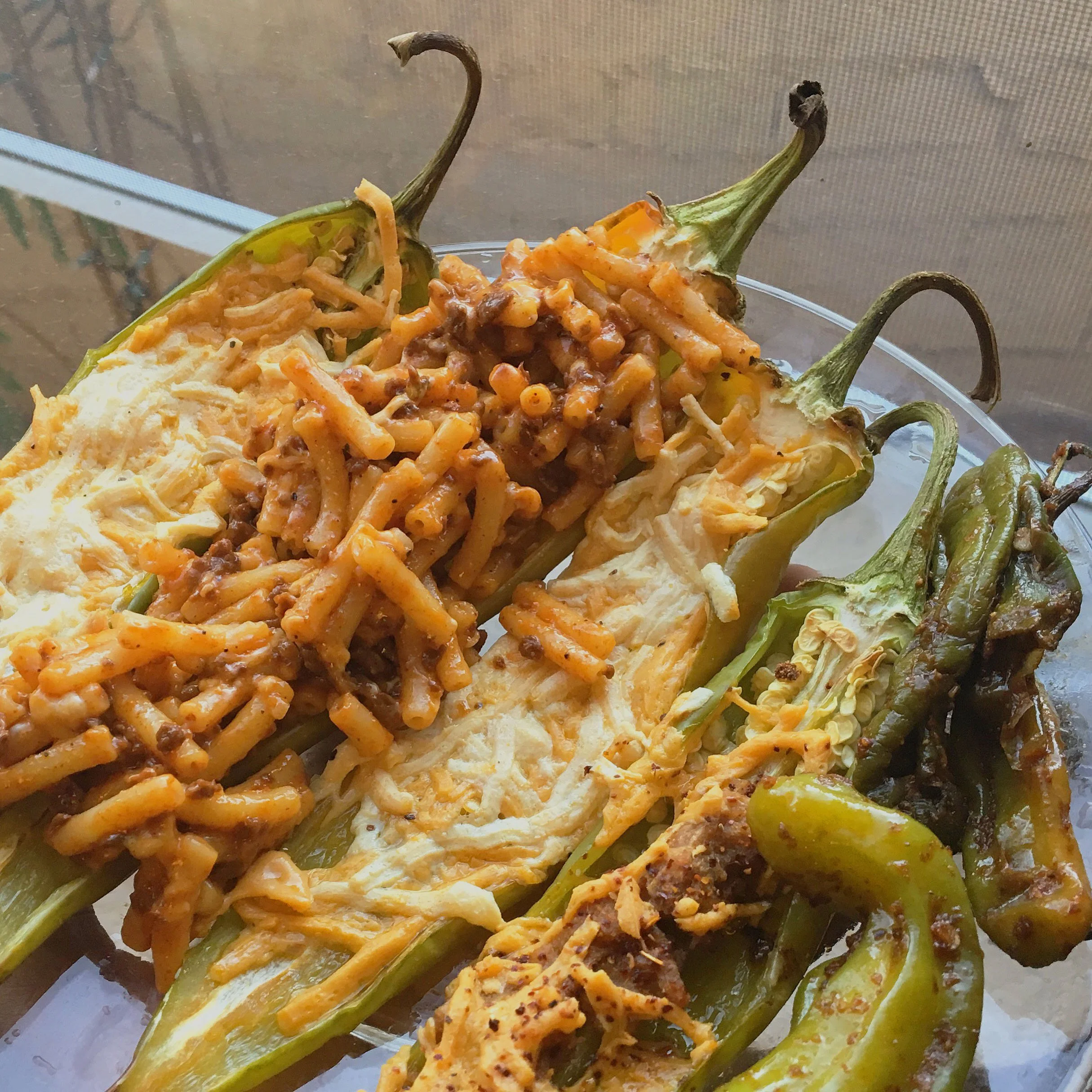 Hatch Peppers with plant mac & cheese, plant cheese & chorizo, + Shishito peppers on the side.