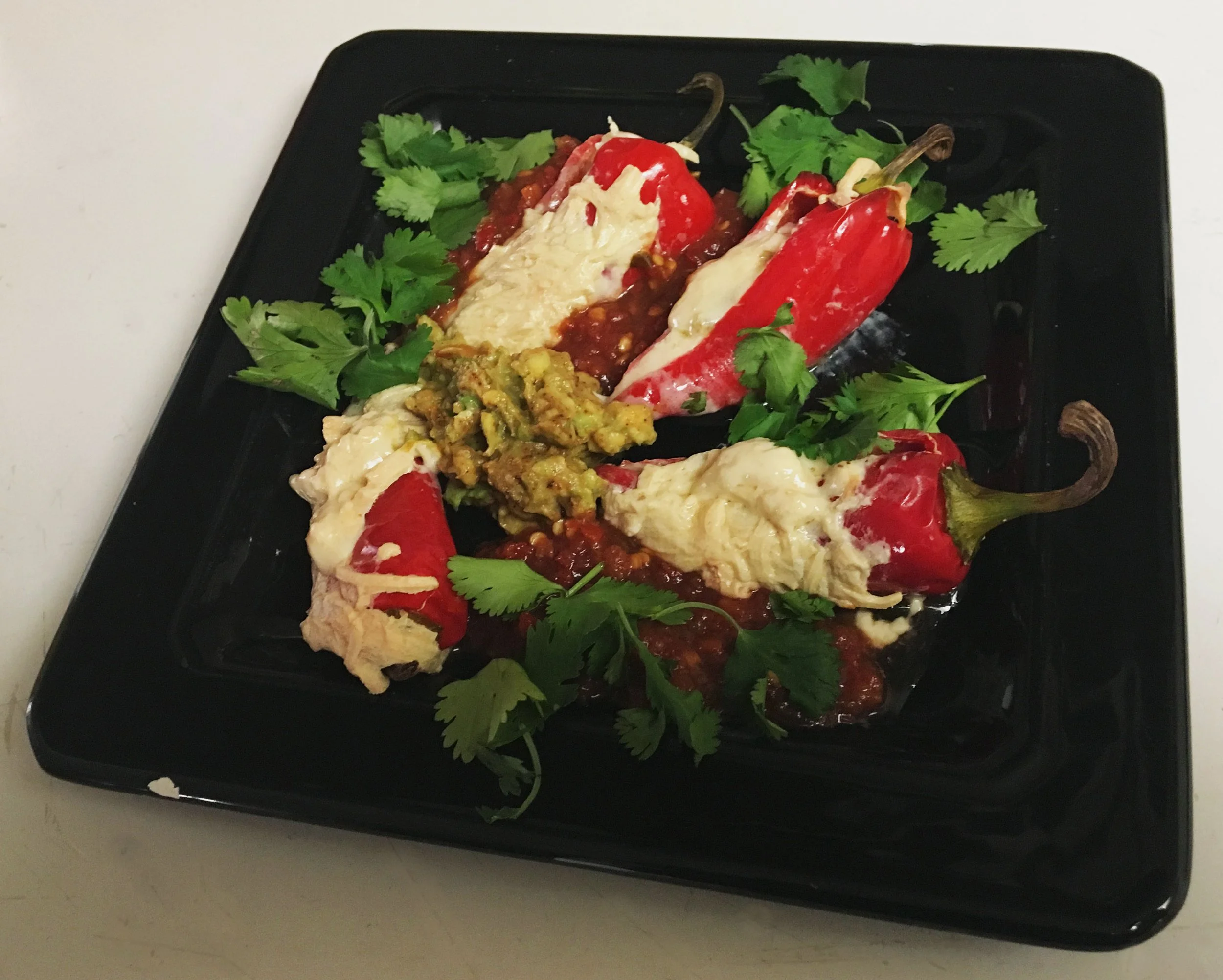 Hatch Peppers with plant cheese, plant sour cream, & Arizona salsa.