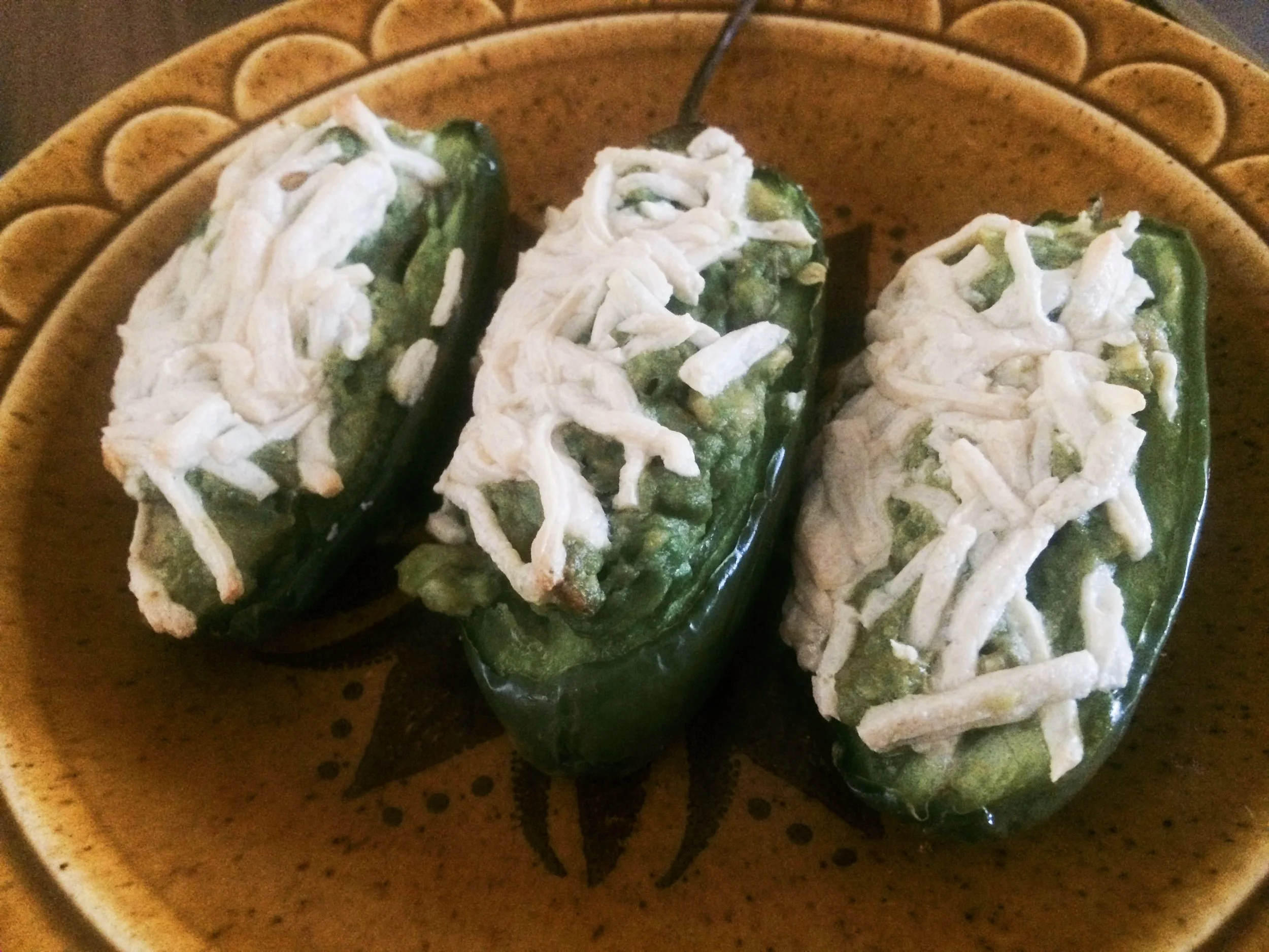 Fresno Peppers with plant cheese & guacamole.