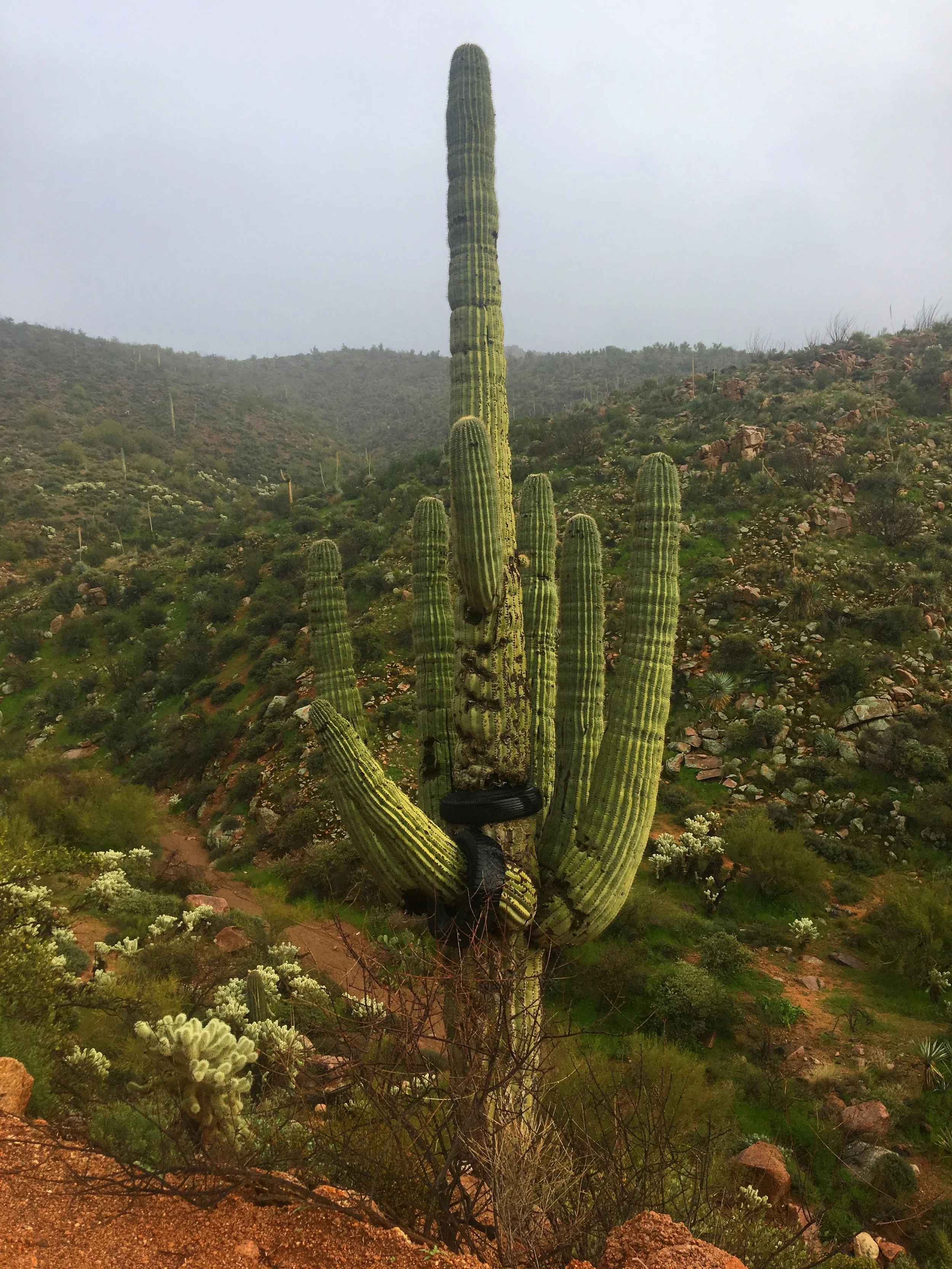 This massive Saguaro grew another arm after some outlaw threw that middle tire. Keeping in mind that it takes 50-100 years for a Saguaro to even begin to grow arms, therefore, any arm that buds THEN takes it's own lengthy time span to actually become an arm. I'm engulfed...obsessed with knowing when the tires were thrown onto the cactus. I’m also inspired at the mighty Saguaro’s ability to not care and carry on.